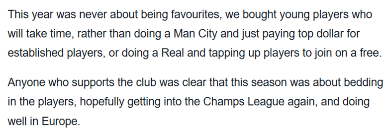 This fits in perfectly with the mentality of the fanbase. They would rather rewrite history and claim Liverpool were never contenders, rather than admit simple underperformance. We all know about the summer crowing, and expectations from fans and media alike, that an era of domination was to follow. It's easy to say with hindsight, but Liverpool's summer recruitment has shades of United's policy for the past decade - signing big name players because they could. Wirtz joined Liverpool on the promise of playing as a number 10, which meant unsettling other players, thus lessening their impact. Luis Diaz has shades of Mahrez, as his good reputation improves with every passing week after his departure, and ripping it up for Bayern Munich helps with that. But it does feel like the impact of those who departed was understated, due to the shiny baubles that arrived. I'm not predicting long-term failure - the quality of some of the players is too high to expect consistent failure. But you can now see why things have gone wrong, and how fragile that squad is, below the surface. Liverpool built a fabulous palace on weak foundations. Failing to sign Guehi was a pointer. The squad looked good on paper, but was always an injury or two away from potential disaster. Bad form and tactical inflexibility has had a similar effect instead.