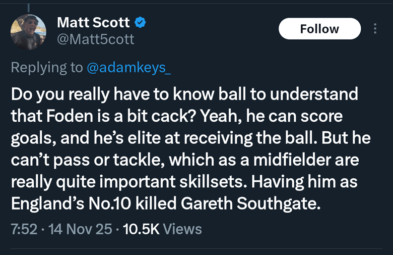 Sadly, quote tweeting this did result in a conversation with Matt. Even sadder, we never got to the bottom of which Phil Foden No.10 performances killed Southgate, due to him never playing in that position.