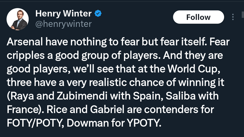 After Wednesday’s bore draw v Sporting he was back with another banal long tweet bigging up Arsenal’s resolve in getting through. Client journalism at its most extreme.